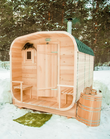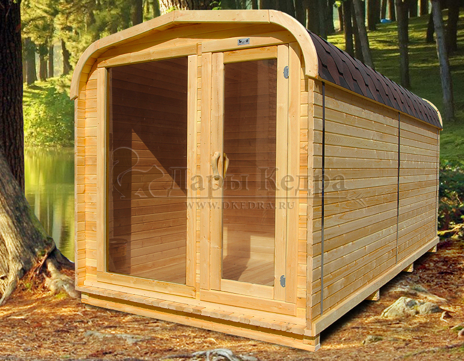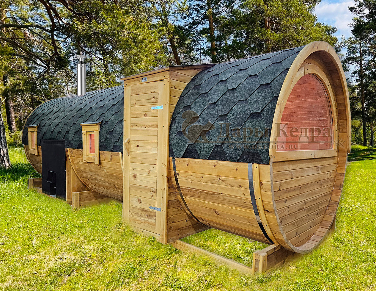 Баня-бочка буханка из кедра 3,5 метра Это более просторная модель за счет увеличенной высоты потолков и ровного пола. В такой модели раздевалка совмещена с моечной. Тут установлен душевой поддон, вешалка, полочка и лавочка из кедра. В парильном отделении по обе стороны расположены двухуровневые открытые полки, печь находится между ними у дальней стены. Время растопки такой бани не превышает 30 минут. По вашему желанию баню-бочку можно укомплектовать козырьком, верандой и печью с внешней загрузкой, благодаря которой весь мусор во время топки остается на улице. Баня-бочка буханка не требует полноценный фундамент, поэтому при необходимости ее можно перенести в другое место. Обращаем Ваше внимание, что в стандартную комплектацию бани входят полки открытого типа в парной с обеих сторон. Дополнительно можно заказать полок закрытого типа или лавку! Кедр обладает ароматическими свойствами. Он не деформируется и влагоустойчив, при правильном уходе за деревом на нем не развиваются грибки и плесень. , ,