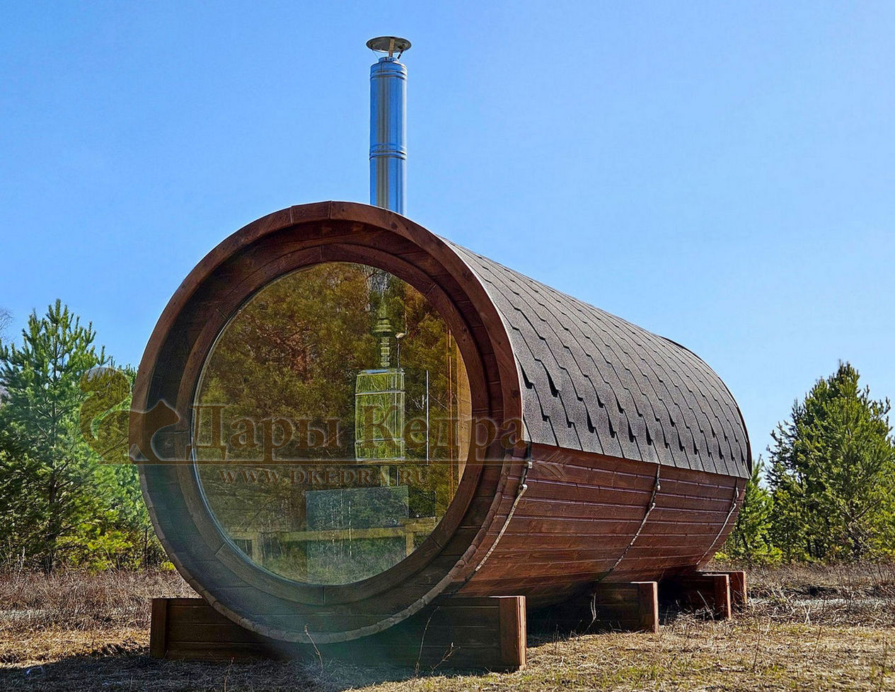 Баня-бочка круглая из кедра 3 метра Это изделие круглой вытянутой формы с двумя отделениями: раздевалкой и парной. Лавочки из кедра находятся по всей длине бани-бочки с обеих сторон. Печь расположена в парилке около дальней стены. Для удобства пользования в раздевалке установлена вешалка и полочка из кедра. За счет небольшой конструкции баня нагревается не более 30 минут. По вашему желанию баню-бочку можно дополнить печью с внешней загрузкой, благодаря которой весь мусор после топки останется на улице. Круглая баня-бочка не требует полноценный фундамент, поэтому при необходимости ее можно перенести в другое место. Обращаем Ваше внимание, что в стандартную комплектацию бани входят лавки в парной с обеих сторон. Дополнительно можно заказать полок открытого или закрытого типа! Кедр обладает ароматическими свойствами. Он не деформируется и влагоустойчив, при правильном уходе за деревом на нем не развиваются грибки и плесень. , ,