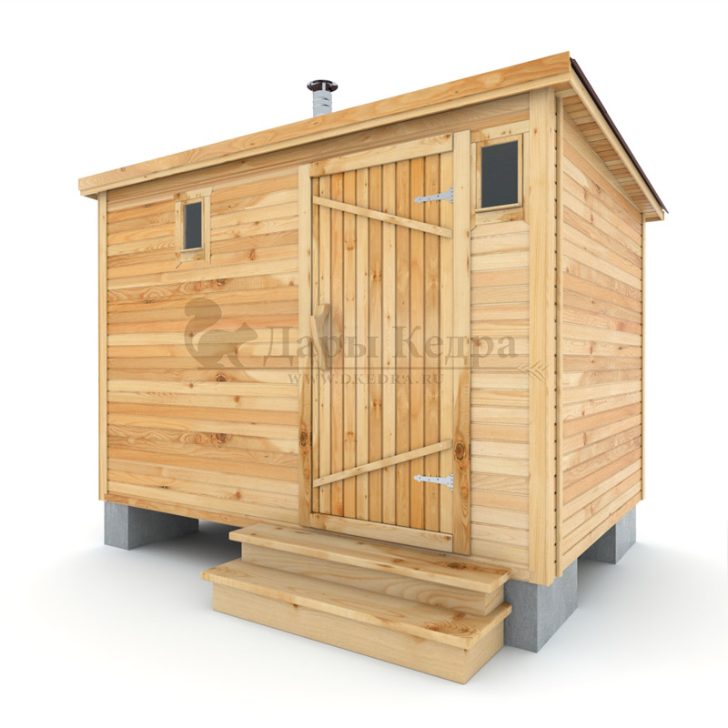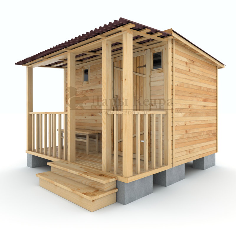 Каркасно-щитовая баня из кедра «Мини» с верандой Это классическая прямоугольная модель бани с двумя отделениями: парилкой и раздевалкой. Для удобства пользования раздевалка оснащена лавочкой и вешалкой. Парилка оборудована двухуровневым открытым полком и печью. За счет небольшой конструкции баня нагревается в течении 30 минут. На просторной веранде можно оставить вещи или отдохнуть после парения. Каркасно-щитовую баню можно заказать как в готовом, так и в разборном варианте. В разборной модели готовые щиты из кедра быстро собираются в полноценное строение, что также позволяет исключить лишний строительный мусор. Такая баня не требует полноценный фундамент, поэтому при необходимости ее можно перенести в другое место. Обращаем Ваше внимание, что в стандартную комплектацию бани входит полок открытого типа в парной. Дополнительно можно заказать полок закрытого типа или лавку! Древесина кедра насыщена эфирными маслами и фитонцидами, которые активируются при воздействии температур. Таким образом, парение в каркаско-щитовых банях из кедра становится еще полезнее. , ,