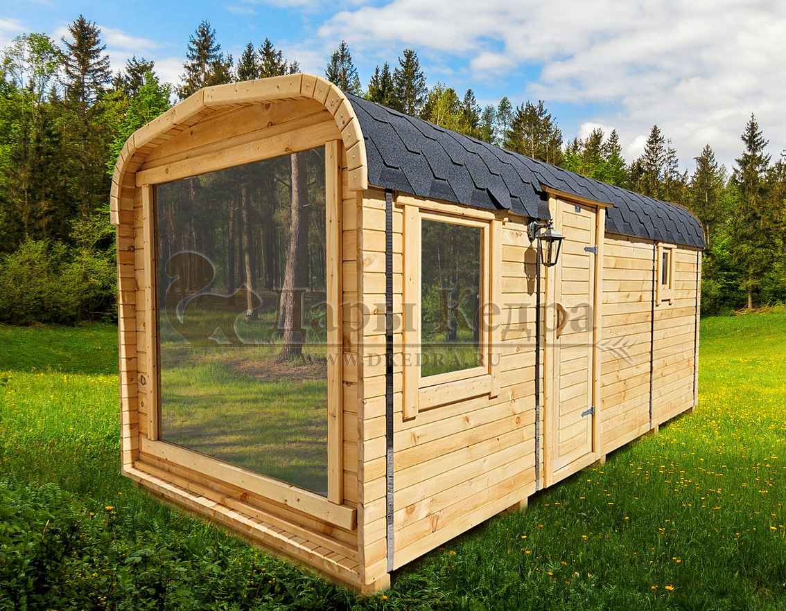 Баня-бочка «Пентагон» с панорамным окном Стильная и современная баня-бочка может быть выполнена длиною от 4 метров, с двумя отделениями (парилка и комната отдыха). Полок может быть, как с двух сторон, так и угловой, в стандарте двухуровневый. Печь в данной модели расположена сбоку с топкой внутрь парилки, либо наружу или в соседнее помещение. Печь можно укомплектовать баком для воды, а саму баню сделать длиною до 6 метров, комфортно разместив в ней дополнительно помывочную. Панорамное окно на входе добавит света и уюта в раздевалке. Установив баню в живописном месте, во время процедур можно наслаждаться видами из окна. В эту модель включено одно закаленное квадратное стекло в комнате отдыха. Обращаем Ваше внимание, по умолчанию в данной модели отсутствует бак для воды, вместо него идёт утеплённая термо-труба, которую можно заменить на бак по желанию. , ,