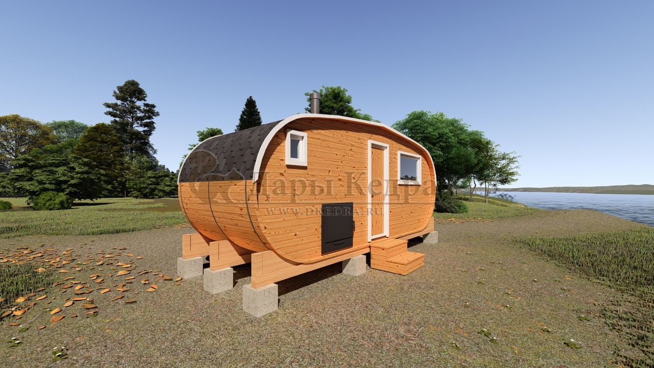 Овальная-Окта баня-бочка из кедра 6х2,2 метра Овальная баня-бочка из кедра просторная и вместительная. Имеет два отделения: раздевалку, которую можно использовать как комнату отдыха, и парилку. Для удобства пользования раздевалка оснащена лавочкой, полкой и вешалкой из кедра. В парильном отделении располагается печь и двухуровневый открытый полок. Для установки такой модели не требуется полноценный фундамент, поэтому при необходимости ее можно перенести на другое место. Так же баню-бочку можно укомплектовать верандой со скамейками, козырьком и печью с внешней загрузкой, благодаря которой весь мусор после топки останется на улице. Древесина кедра насыщена эфирными маслами и фитонцидами, которые активируются при воздействии температур. Таким образом, парение в каркаско-щитовых банях из кедра вдвойне полезно.