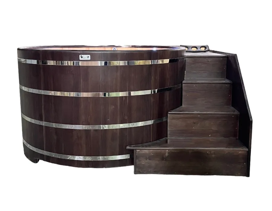 Особенность этой модели заключается в сборке купели по технологии лунный-паз. Паз (углубление) одной доски прочно соединяется с выемкой следующей. Такая сборка осуществляется без клея и гвоздей. Готовая конструкция прочно фиксируется нержавеющими обручами. Пластиковая вставка придает изделию красивый внешний вид, увеличивает срок службы и облегчает уход за купелью. Для удобства пользования купель оснащена лавочками, приставной и внутренней лестницей из кедра. Подходит для комнатного и уличного использования.