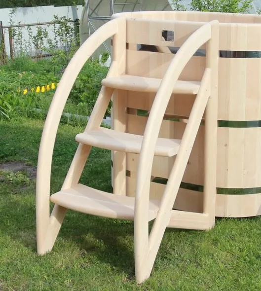 Приставная лестница с тремя ступенями и закруглёнными перилами обеспечит максимальный комфорт при входе и выходе из купели.