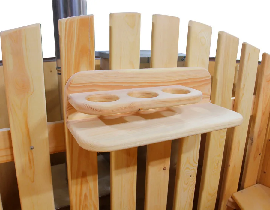 Полка крепится к борту с внутренней части купели. Будет удобна для напитков, посуды, или любых других не очень больших, но нужных вещей.