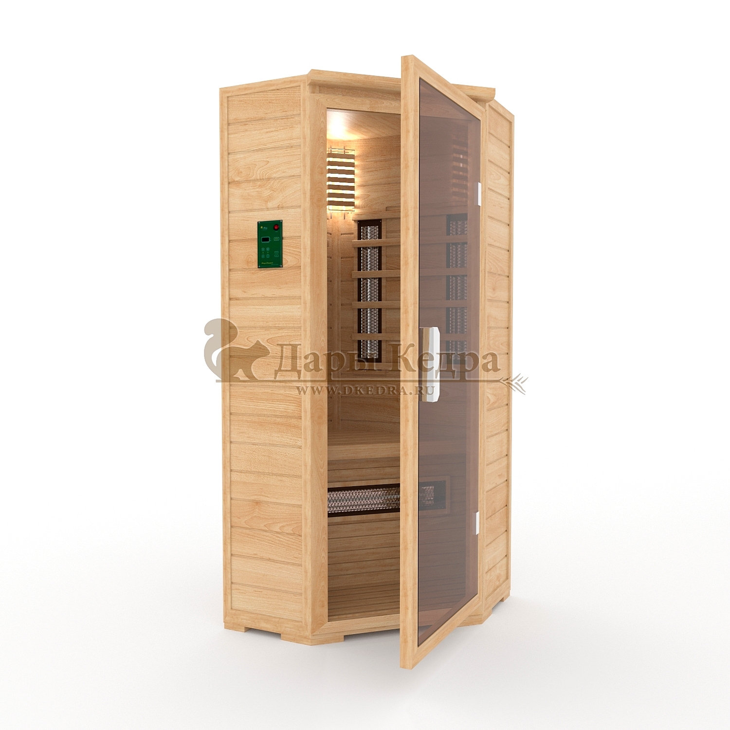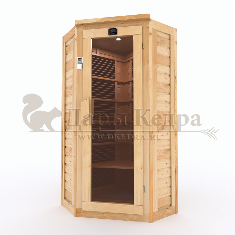 Одноместная угловая инфракрасная сауна кабина из кедра с керамическими излучателями Это специально оборудованная кедровая кабина для прогрева тела человека сухим теплом. Воздух в таких парных не нагревается. Инфракрасные лучи воздействуют на тело, равномерно прогревая мышцы, суставы и органы. Керамические излучатели похожи на лампы, имеют высокую температуру нагрева, поэтому защищены противоожоговыми решетками. Тело человека в таких саунах нагревается интенсивнее. Работает кабина за счет электричества. Установка сауны в угол, позволяет рационально использовать пространство помещения. Подходит как для домашнего использования, так и для коммерции. Обращаем Ваше внимание что в стандартную комплектацию входит трапик для ног, но вы можете его заменить на цельный пол совершенно бесплатно! Целебная древесина кедра и инфракрасные лучи благотворно влияют на организм человека в целом. При регулярном использовании инфракрасной сауны укрепляется иммунитет, улучшается кровообращение и состояние кожи, выводятся токсины.