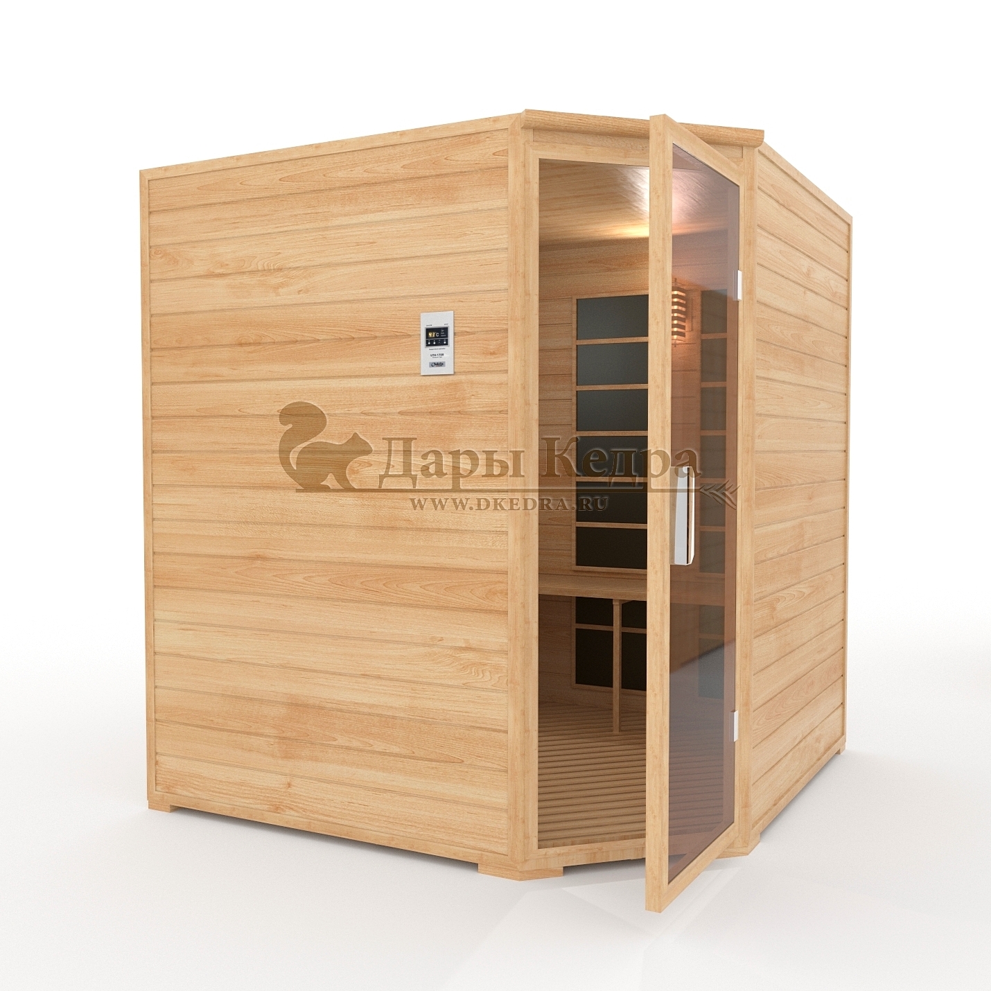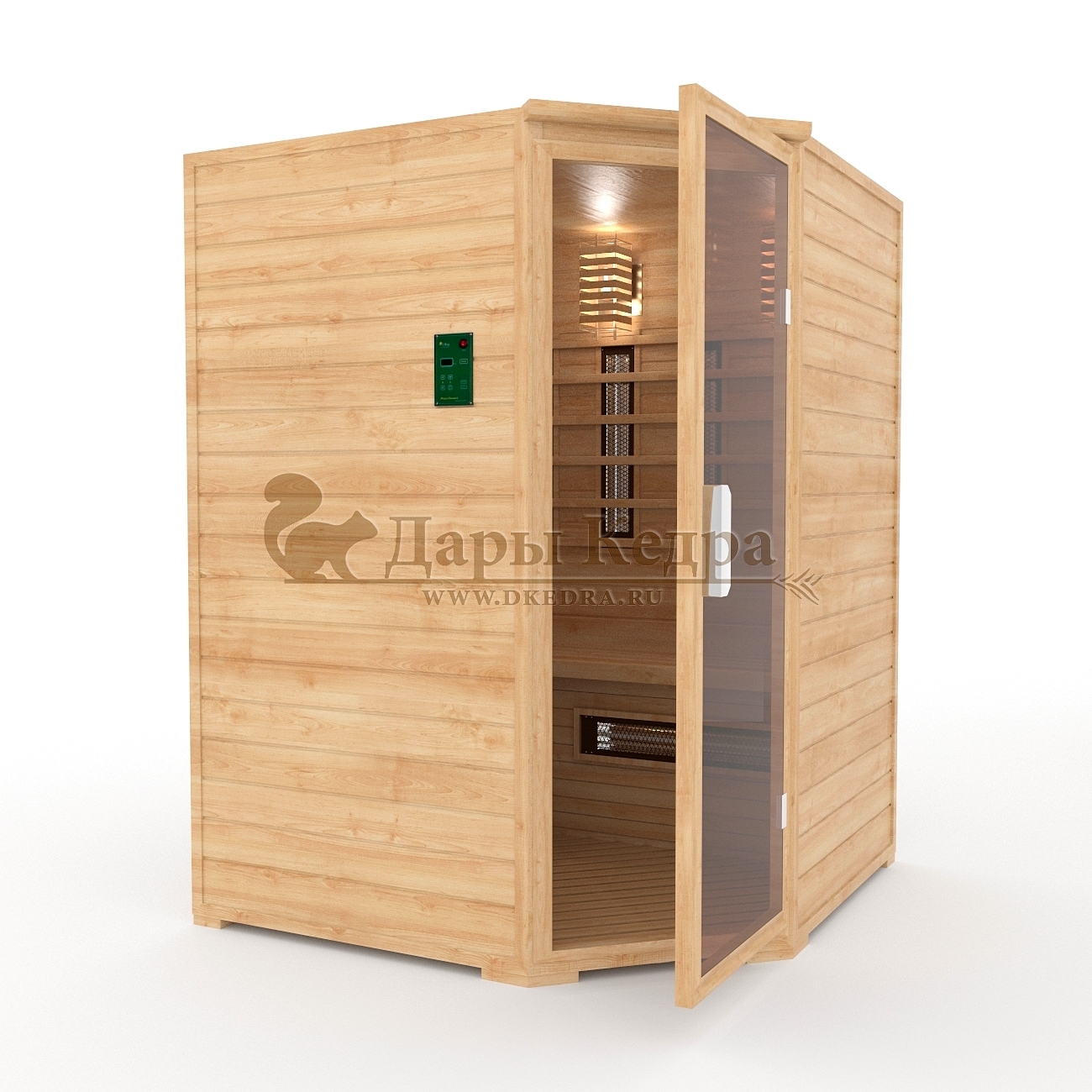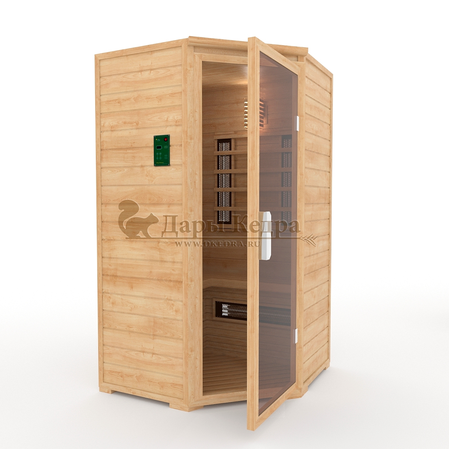 Двухместная угловая инфракрасная сауна кабина из кедра с керамическими излучателями Это специально оборудованная кедровая кабина для прогрева тела человека сухим теплом. Воздух в таких парных не нагревается. Инфракрасные лучи воздействуют на тело, равномерно прогревая мышцы, суставы и органы. Керамические излучатели похожи на лампы, имеют высокую температуру нагрева, поэтому защищены противоожоговыми решетками. Тело человека в таких саунах нагревается интенсивнее. Работает кабина за счет электричества. Установка сауны в угол, позволяет рационально использовать пространство помещения. Подходит как для домашнего использования, так и для коммерции. Обращаем Ваше внимание что в стандартную комплектацию входит трапик для ног, но вы можете его заменить на цельный пол совершенно бесплатно! Целебная древесина кедра и инфракрасные лучи благотворно влияют на организм человека в целом. При регулярном использовании инфракрасной сауны укрепляется иммунитет, улучшается кровообращение и состояние кожи, выводятся токсины.